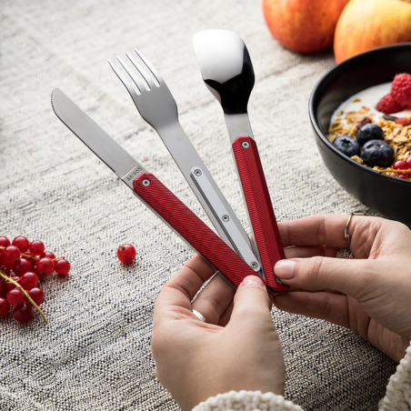 Couverts en acier inoxydable martensitique 2CR14, finition poli miroir. Composé d’une grande cuillère, d’une fourchette 4 dents et d’un couteau à lame micro dentée. Manche aluminium. Assemblage aimanté. Livré avec étui de transport en polypropylène rigide (PP).