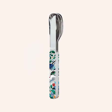 Couverts en acier inoxydable martensitique 2CR14, finition poli miroir. Composé d’une grande cuillère, d’une fourchette 4 dents et d’un couteau à lame micro dentée. Manche en polymère (PC) transparent décoré. Assemblage aimanté.
