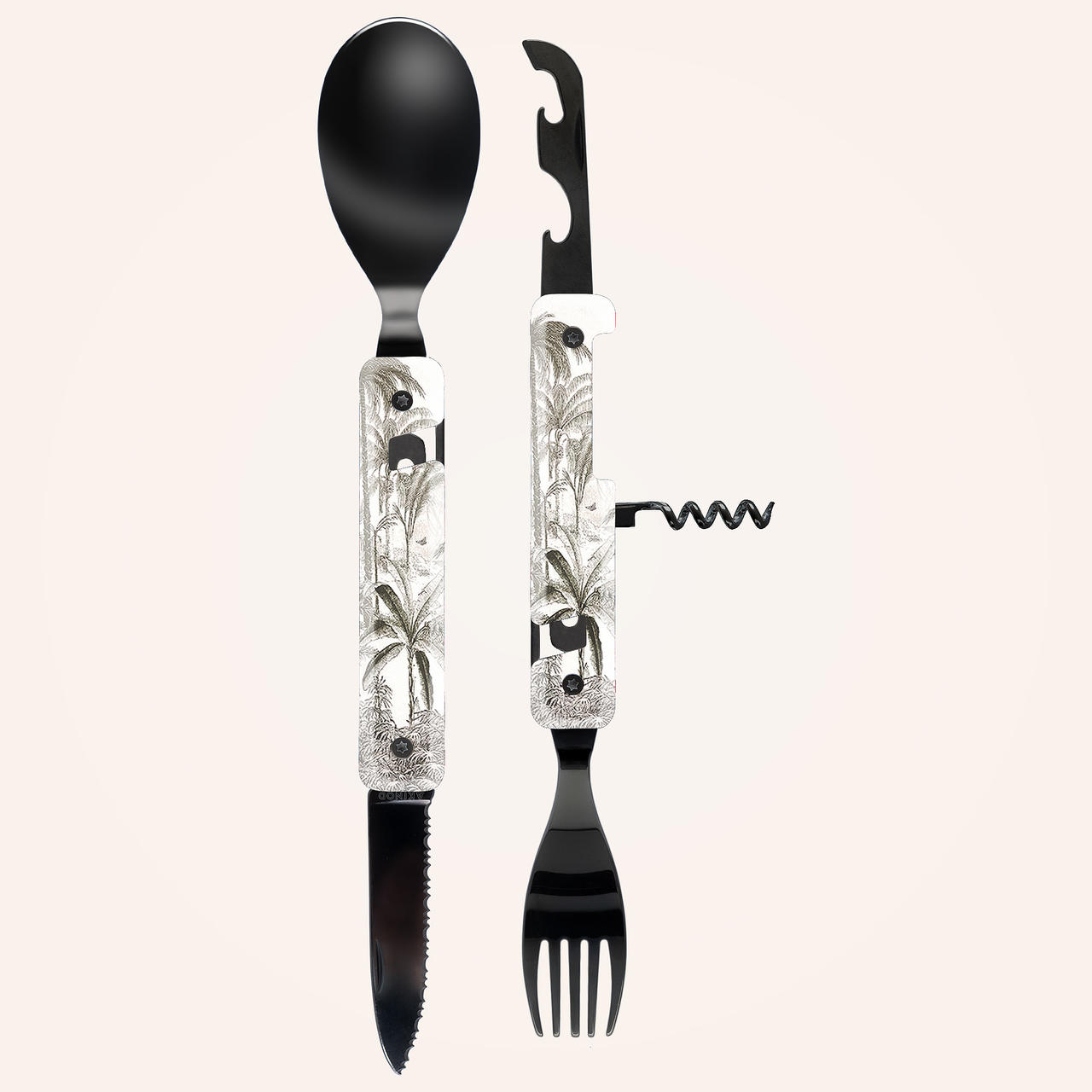 Couverts multifonctions en acier inoxydable martensitique 2CR14, finition noire brillante. Composé d’une grande cuillère, d’une fourchette 5 dents, d’un couteau à lame micro dentée, d’un tire-bouchon 4 spirales, d’un outre boîte et d’un décapsuleur. Manche en polymère (PC) transparent décoré. Assemblage aimanté. Livré avec étui de transport en polypropylène rigide (PP).