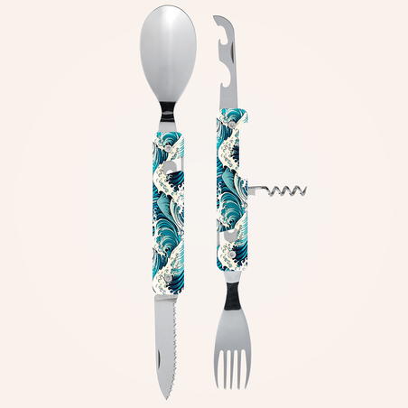 Couverts multifonctions en acier inoxydable martensitique 2CR14,  finition poli miroir. Composé d’une grande cuillère, d’une fourchette 5 dents, d’un couteau à lame micro dentée, d’un tire-bouchon 4 spirales, d’un outre boîte et d’un décapsuleur. Manche en polymère (PC) transparent décoré. Assemblage aimanté. Livré avec étui de transport en polypropylène rigide (PP).