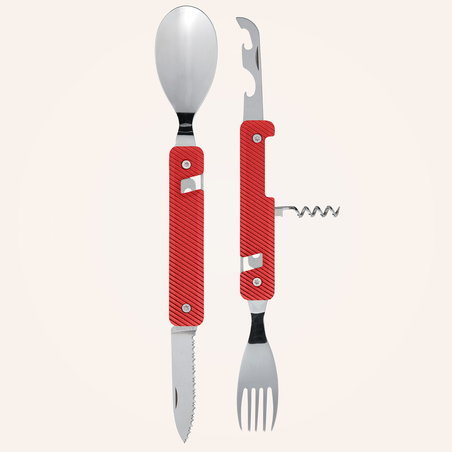 Couverts multifonctions en acier inoxydable martensitique 2CR14, finition poli miroir. Composé d’une grande cuillère, d’une fourchette 5 dents, d’un couteau à lame micro dentée, d’un tire-bouchon 4 spirales, d’un outre boîte et d’un décapsuleur. Manche en aluminium. Assemblage aimanté. Livré avec étui de transport en polypropylène rigide (PP).