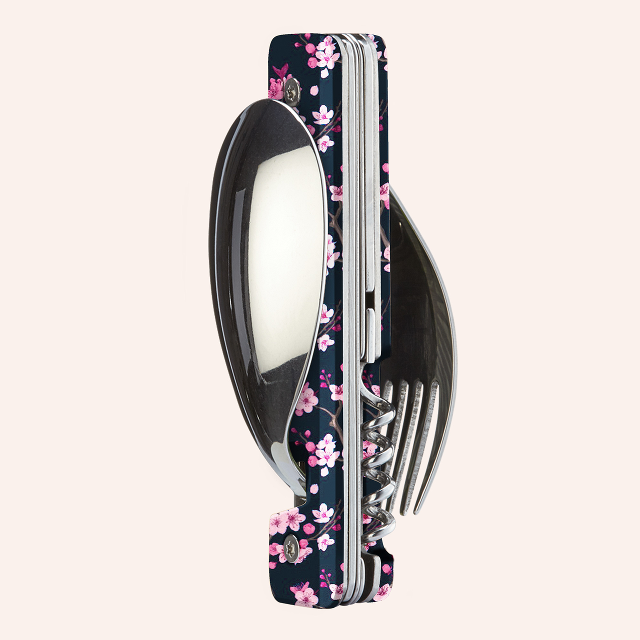 Couverts multifonctions en acier inoxydable martensitique 2CR14,  finition poli miroir. Composé d’une grande cuillère, d’une fourchette 5 dents, d’un couteau à lame micro dentée, d’un tire-bouchon 4 spirales, d’un outre boîte et d’un décapsuleur. Manche en polymère (PC) transparent décoré. Assemblage aimanté. Livré avec étui de transport en polypropylène rigide (PP).
