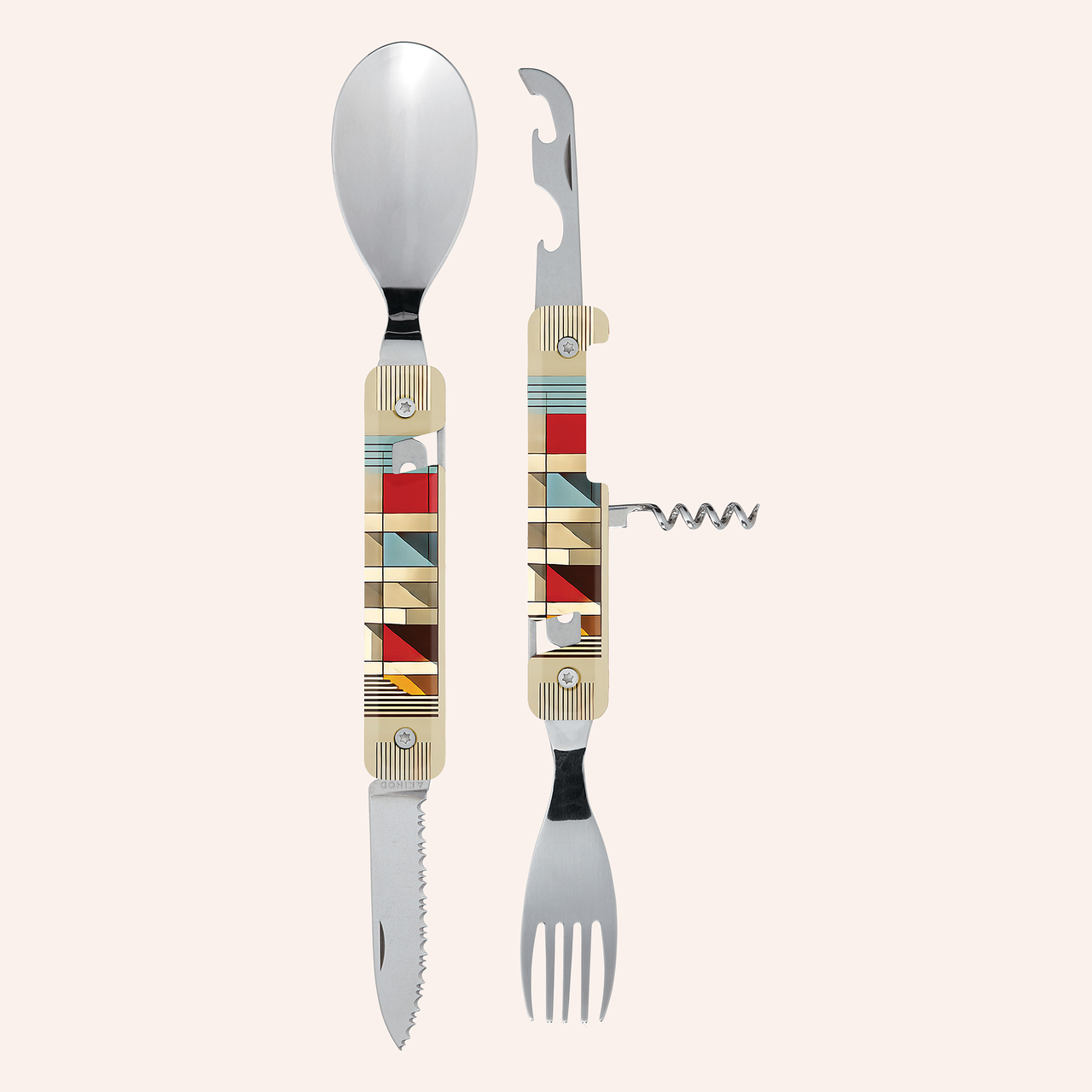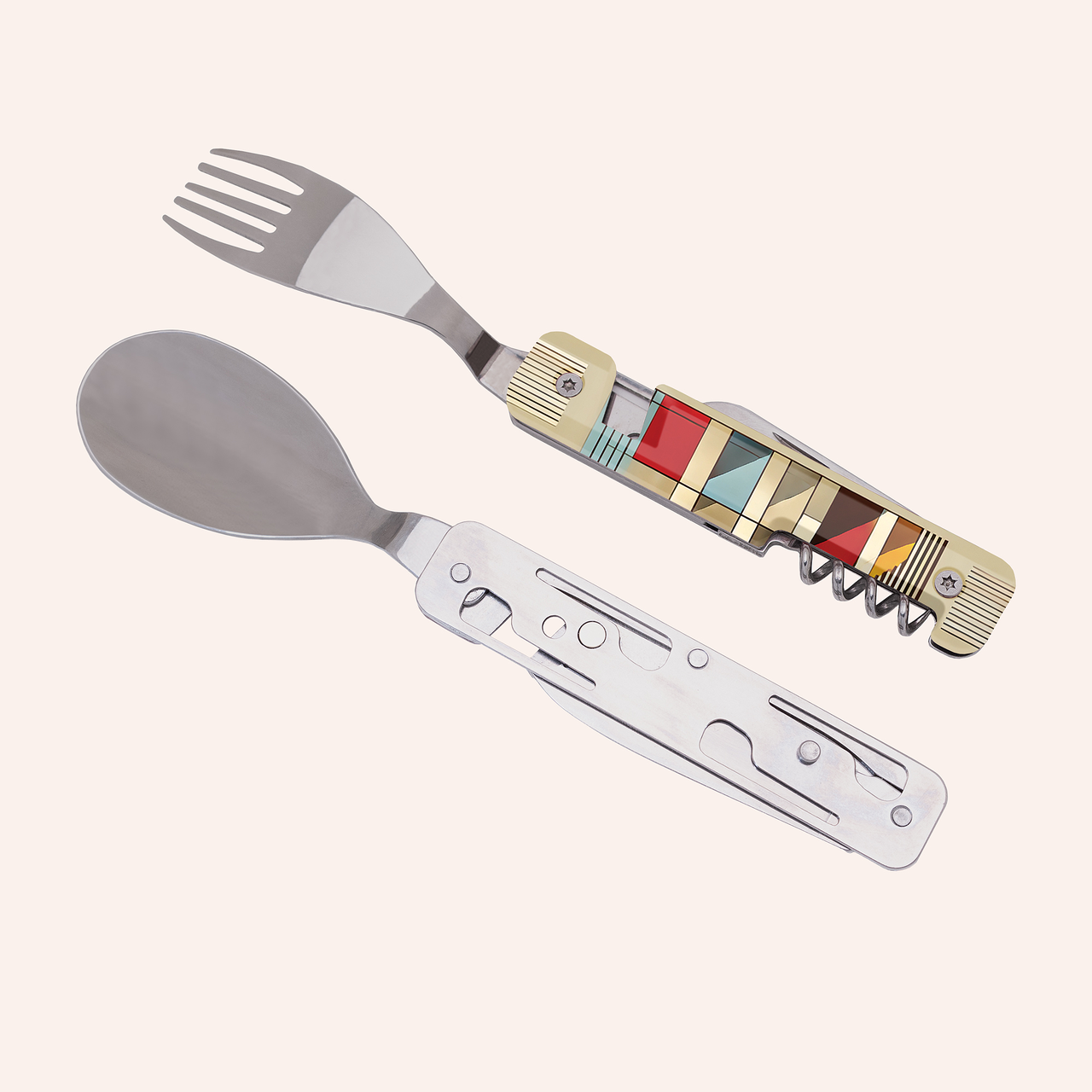 Couverts multifonctions en acier inoxydable martensitique 2CR14,  finition poli miroir. Composé d’une grande cuillère, d’une fourchette 5 dents, d’un couteau à lame micro dentée, d’un tire-bouchon 4 spirales, d’un outre boîte et d’un décapsuleur. Manche en polymère (PC) transparent décoré. Assemblage aimanté. Livré avec étui de transport en polypropylène rigide (PP).