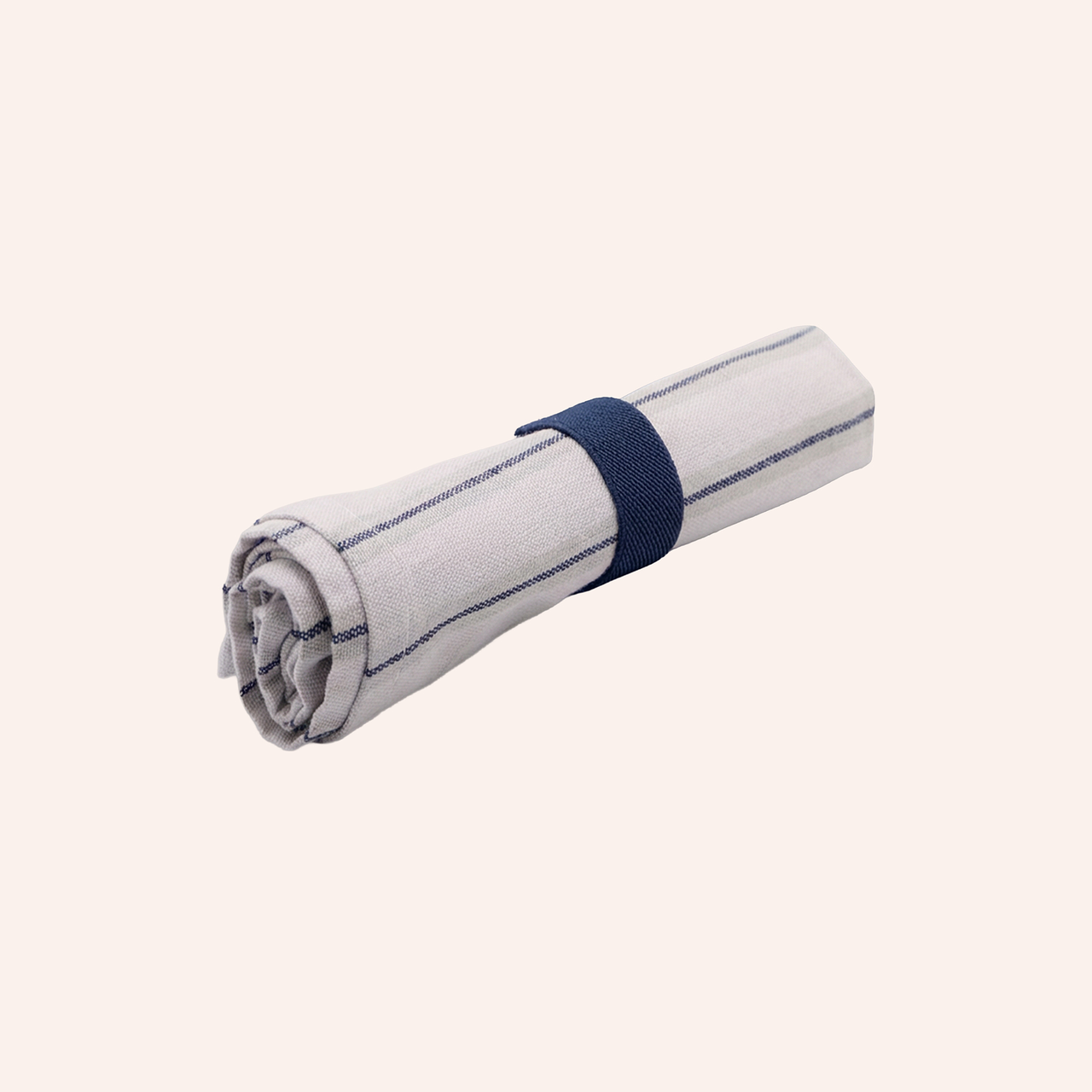 Cette serviette 100% coton a été pensée pour vous permettre de transporter vos couverts Akinod préférés en toute simplicité. Le "wrap de transport" protège ainsi le contenu du sac, évite que les couverts ne s’entrechoquent ou ne salissent quoi quece soit. Les couverts sont glissés dans une poche solidement cousue à l’intérieur de la serviette, puis l’ensemble est roulé et maintenu par un large ruban élastique tissé, qui fait office de rond de serviette.