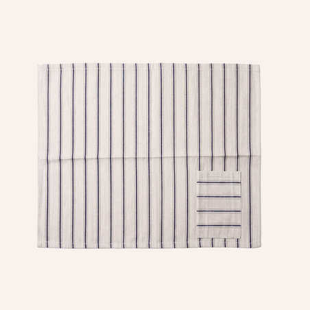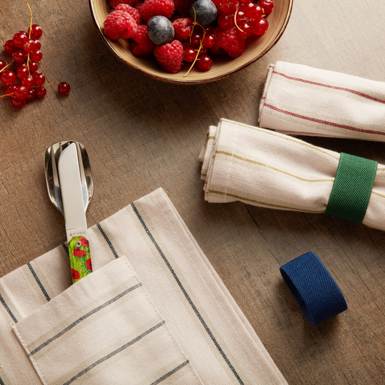 Derrière sa simplicité assumée se cache une idée limpide : une serviette de table munie d’une poche cousue permettant d’y glisser ses couverts Akinod préféré.